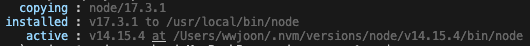 설치는 잘 되었지만 현재 버전을 확인하면 아직 v14.15.4로 보입니다. 원인은 installed path와 active path가 다르기 때문입니다.