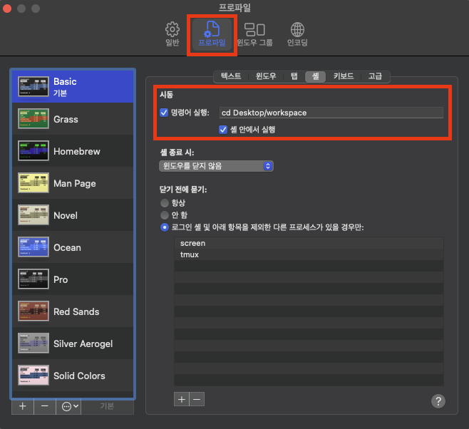 2. 상단 프로파일 탭으로 이동 > 명령어 실행을 체크해 주고 기본 경로를 넣어준다.