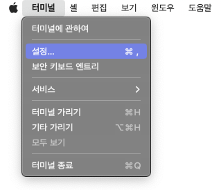 1. 터미널을 열어주고 상단 메뉴 > 터미널 > 설정으로 이동해 준다.