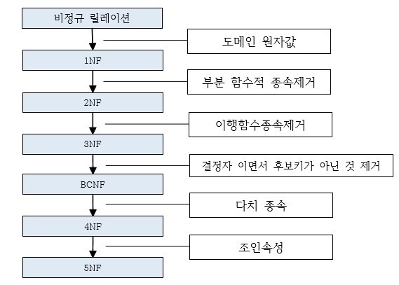 정규화는 관계형 데이터 베이스에서 설계할 때 중복을 최소화하기 위해 데이터를 구조화하는 작업을 말합니다. 일반적으로 아래와 같은 단계를 거쳐 수행됩니다.