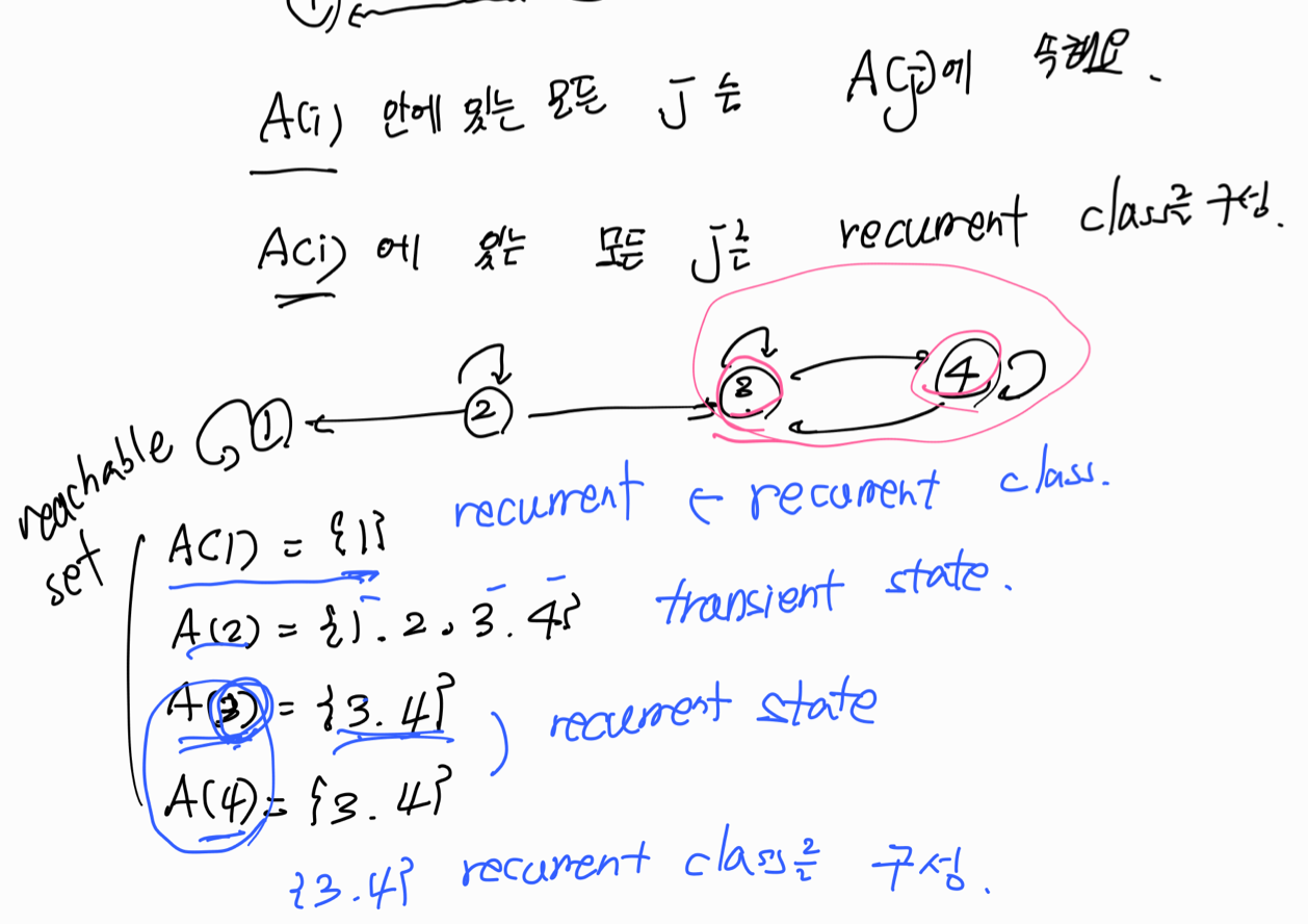 i에서 갈 수 있는 모든 set, i에서 j로 변할 수 있고 j에서 i로도 변할 수 있으면 i와 j state가 communicate 할 수 있다고 얘기한다, 한 번에 도달하지 않아도 도달할 수 있으면 된다.