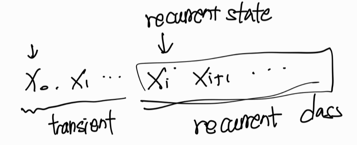 state가 변화를 하다가 어느 순간 recurrent class에 들어가 버린다면, 앞으로의 state는 영원히 recurrent class안에 머무를 수밖에 없다. 왜냐하면 나갈 수 있는 엣지가 존재하지 않기 때문이다. 그리고 만약 현재 state가 transient state라면 transient state의 변화는 일정구간 transient state고 일정구간은 recurrent state로 구성되어 있는 시퀀스로 바뀔 수 있다.