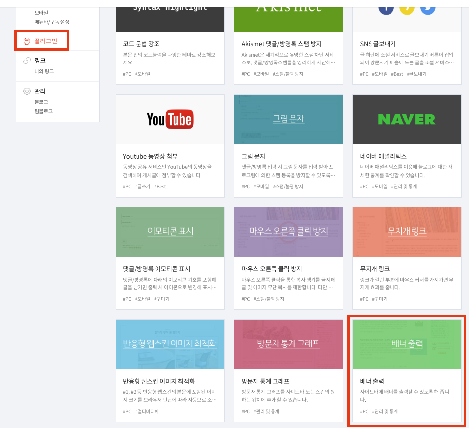 11. 좌측 사이드 메뉴에 "플러그인"클릭 후 우측 하단에 "배너 출력"박스를 클릭해줍니다.