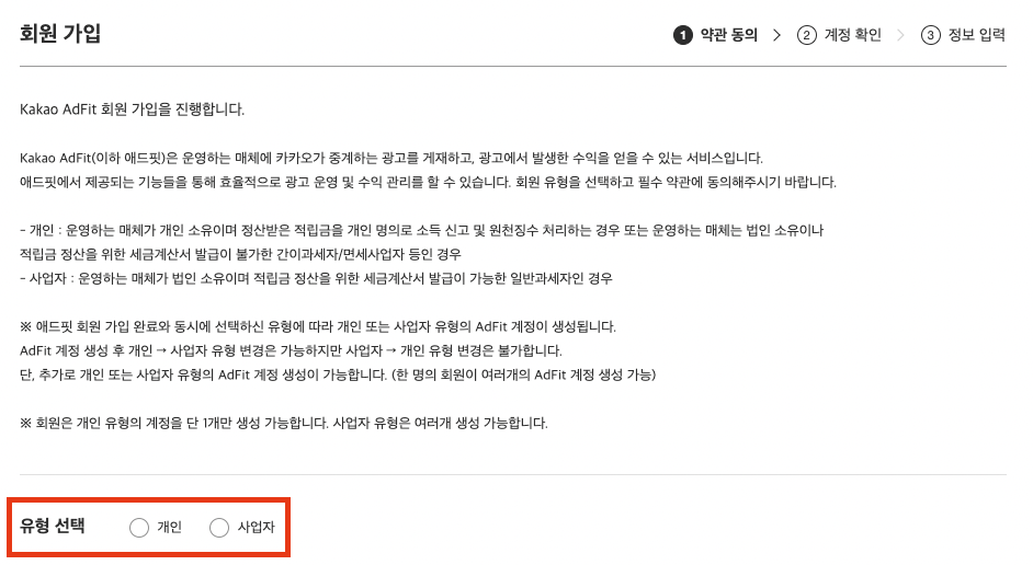 3. 유형을 선택하고 애드 핏 회원가입을 진행합니다.