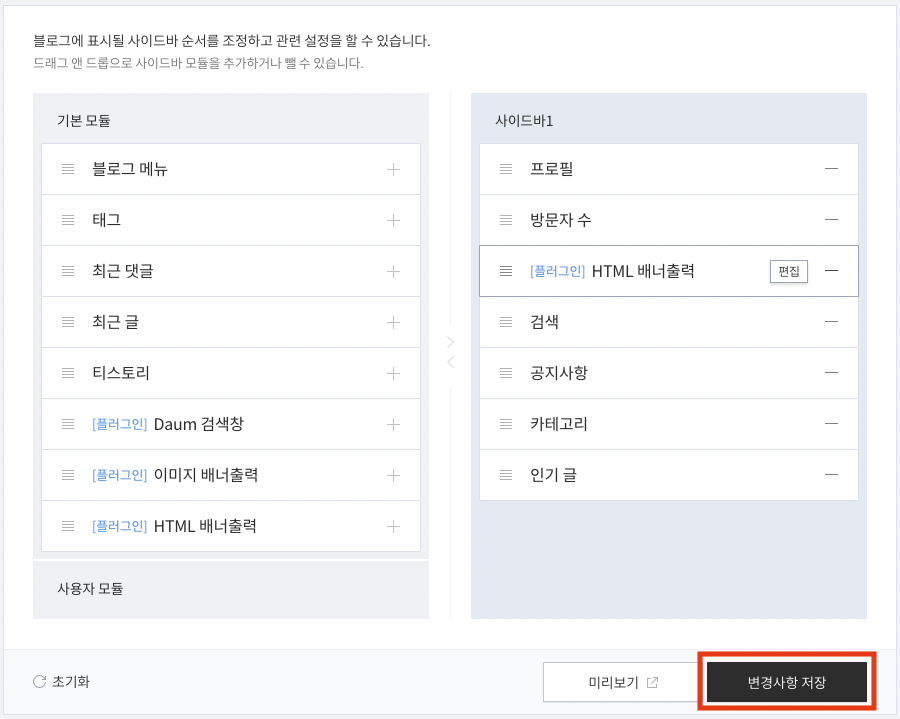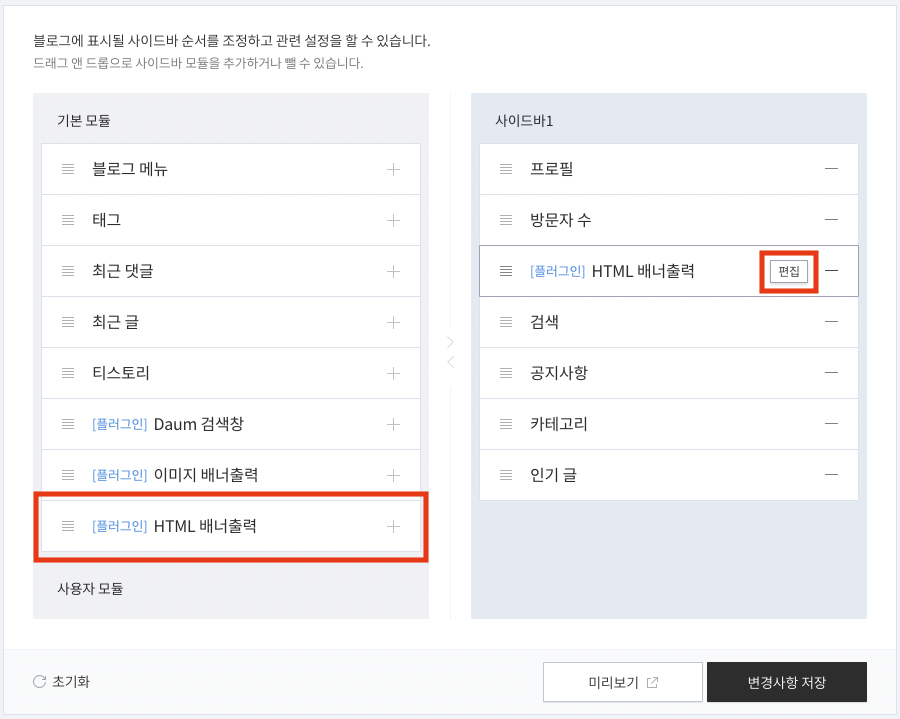 HTML 배너 출력을 추가해주고 "편집"을 클릭합니다.