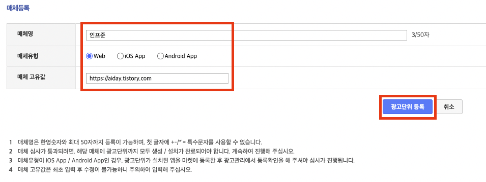 8. 매체명을 자유롭게 작성해주고 매체유형을 Web으로 선택 후 매체 고윳값에 내 블로그 URL를 넣어 등록을 클릭합니다.