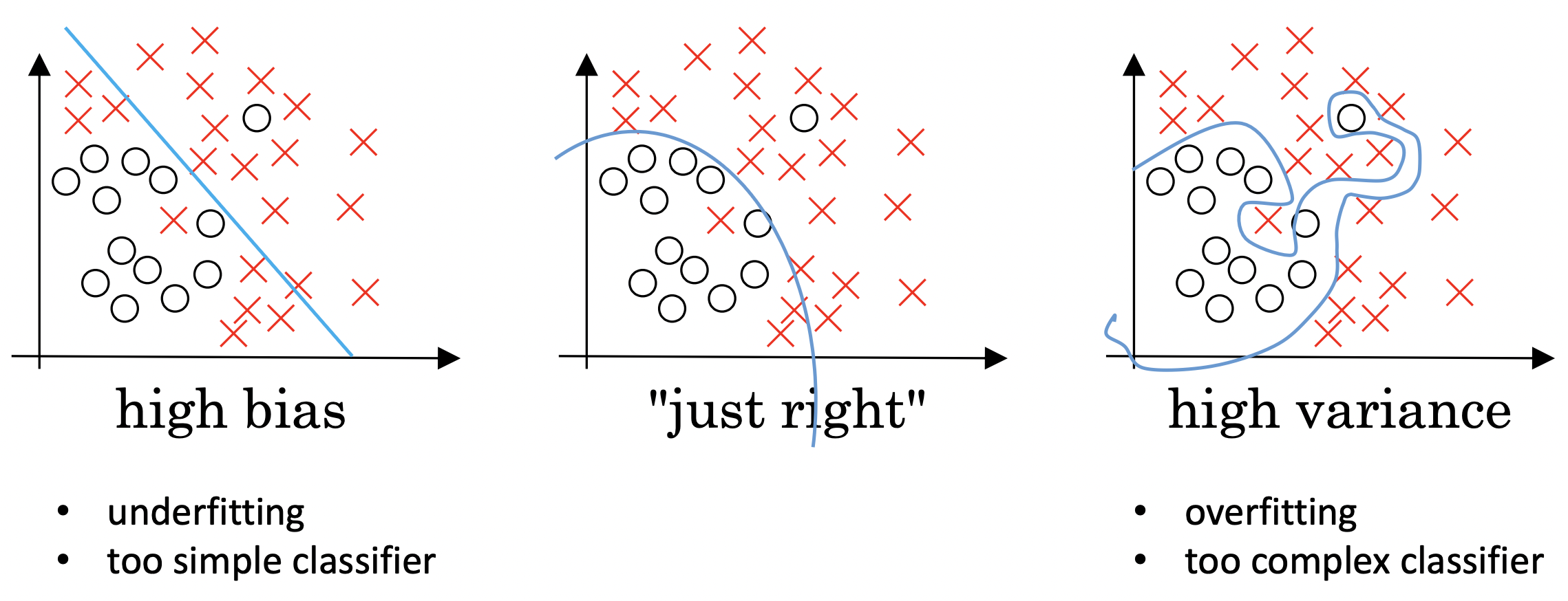 간단하게 피자로 예를 들어 보면 Underfitting은 피자의 동그랗다는 특징처럼 간단하고 적은 특징만 학습되어 모든 동그란 물체를 피자라고 판단하는 경우이고 Overfitting은 불고기와 야채들이 올라가 있는 것처럼 세세하고 많은 특징까지도 학습되어 불고기가 안 보이는 피자는 피자가 아니라고 판단하는 경우입니다.