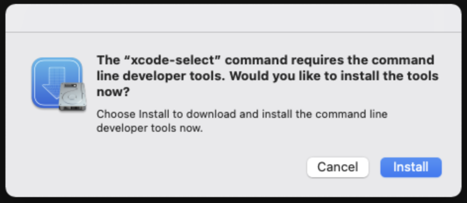 해결 방법은 간단하게 위 명령어를 터미널에 입력해 주어 command line developer tools를 설치하면 문제가 해결됩니다.