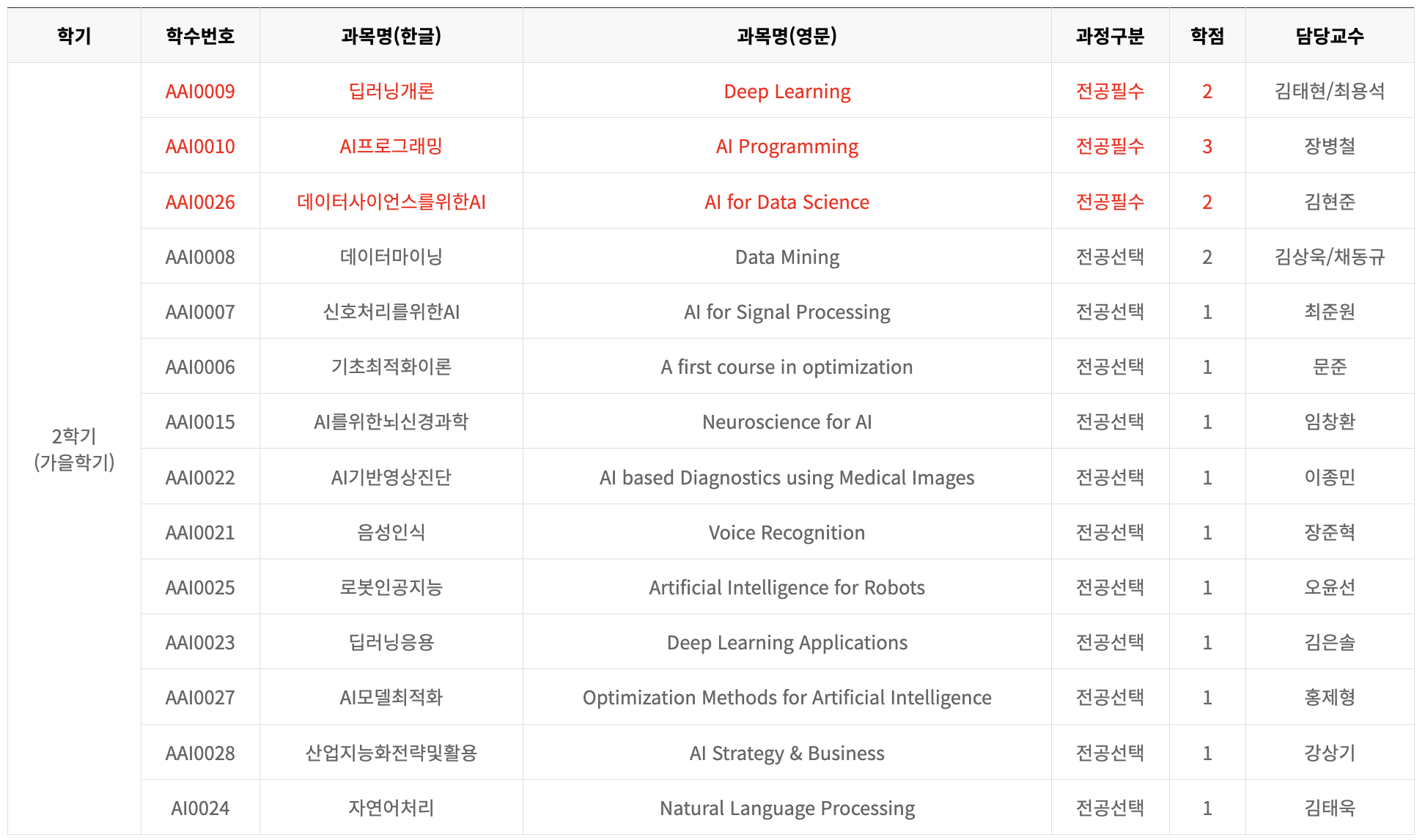 AI분야는 역사가 짧기에 상대적으로 깊이가 깊지는 않지만 정말 넓은 학문인 것 같습니다. 앤드류 응 박사님의 "AI는 새로운 전기( AI is new electricity )"라는 표현처럼 다양한 분야에 적용 가능한 학문이기에 같이 입학한 동기 선생님들의 백그라운드도 정말 다양했습니다. 그로 인해 학기 초 수업에 대한 난이도 조절이 쉽지 않아 교수님들과 학과 사무실에서 감사하게도 노력을 많이 해주셨습니다.