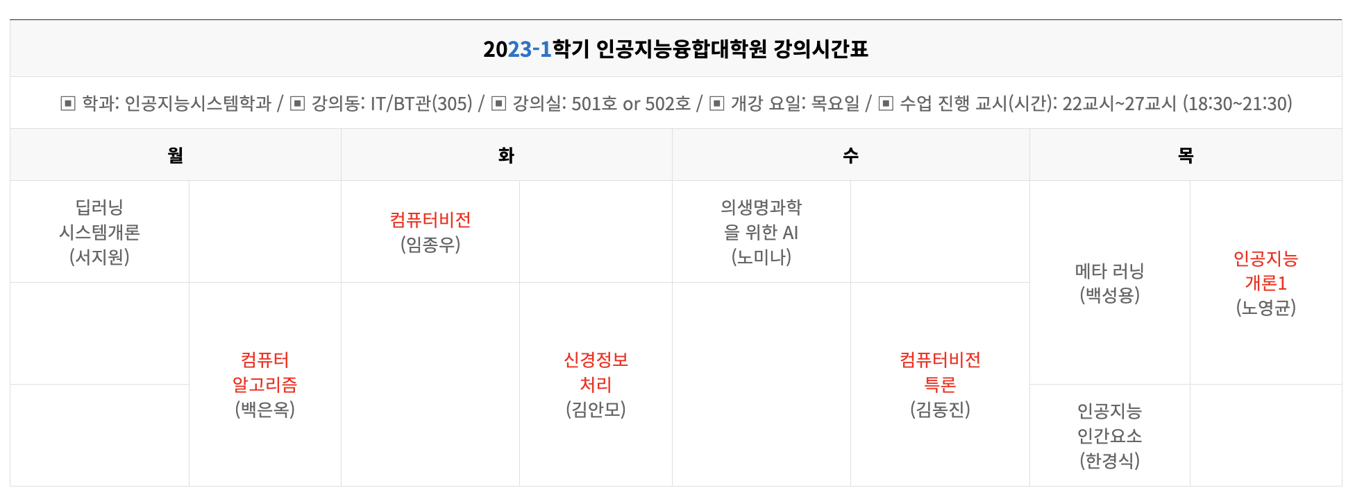 과목은 매 학기마다 다를 수 있으며 아래 과목은 2022년도 기준입니다. 수업은 교수님들께서 다양한 백그라운드를 가진 점과 직장 생활을 하는 점들을 많이 배려해 주시면서 열의 있게 지도해 주셔서 만족스러웠습니다. 하지만 각자가 부족한 이론에 대해서는 하나하나 설명하는 건 모두가 원하지 않았기도 했고 그럴 수도 없기에 개인적인 공부가 필요합니다.